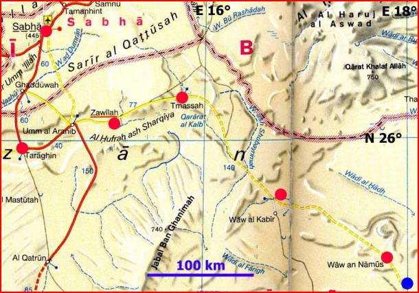 Southern Libya, about 50 km South-South-East from the famous volcano crater Waw