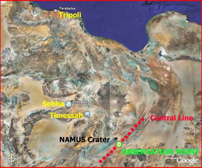 Observation Point: 300 km (1.5 days, no roads). Tripoli - Namus Crater: 1000