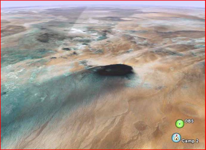 Waw an Namus (Mosquito Crater) and area of Observation Point (tilted view, in foreground 60 km wide, at the position of the crater